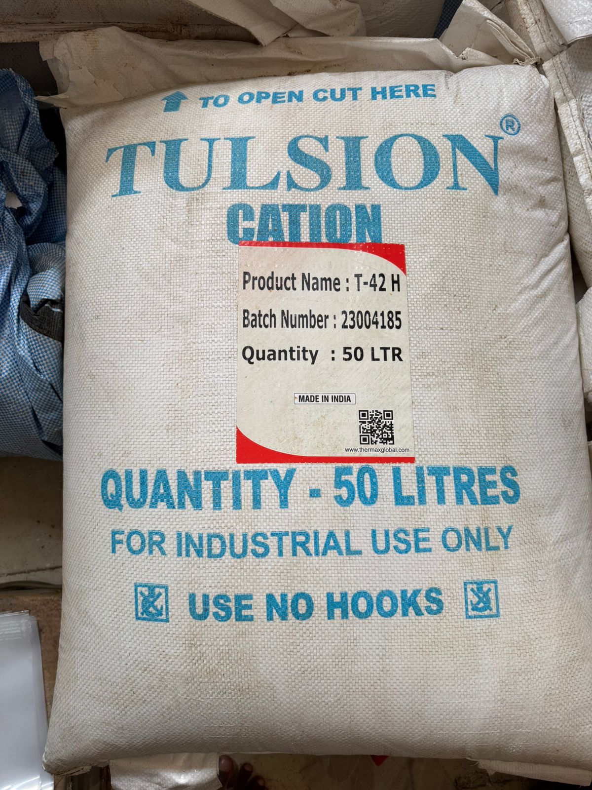 Tulsion T-42 Na+ (Thermax make) is a premium strong acid cation (SAC) exchange resin supplied in the sodium form, commonly used for water softening, dealkalization pre-treatment, and as a cation bed in demineralization trains. It consists of sulfonated polystyrene-divinylbenzene beads with high exchange capacity and excellent mechanical/osmotic stability. What it is Type: Strong acid cation exchange resin (gel type) on a polystyrene-DVB matrix with nuclear sulfonic functional groups, supplied in Na+ form for softening and general cation exchange service. Appearance/form: Amber, moist spherical beads designed for high bead strength and resistance to osmotic shock, enabling stable operating capacity across varied conditions. This type resin is mainly used for Demineralized Plants.